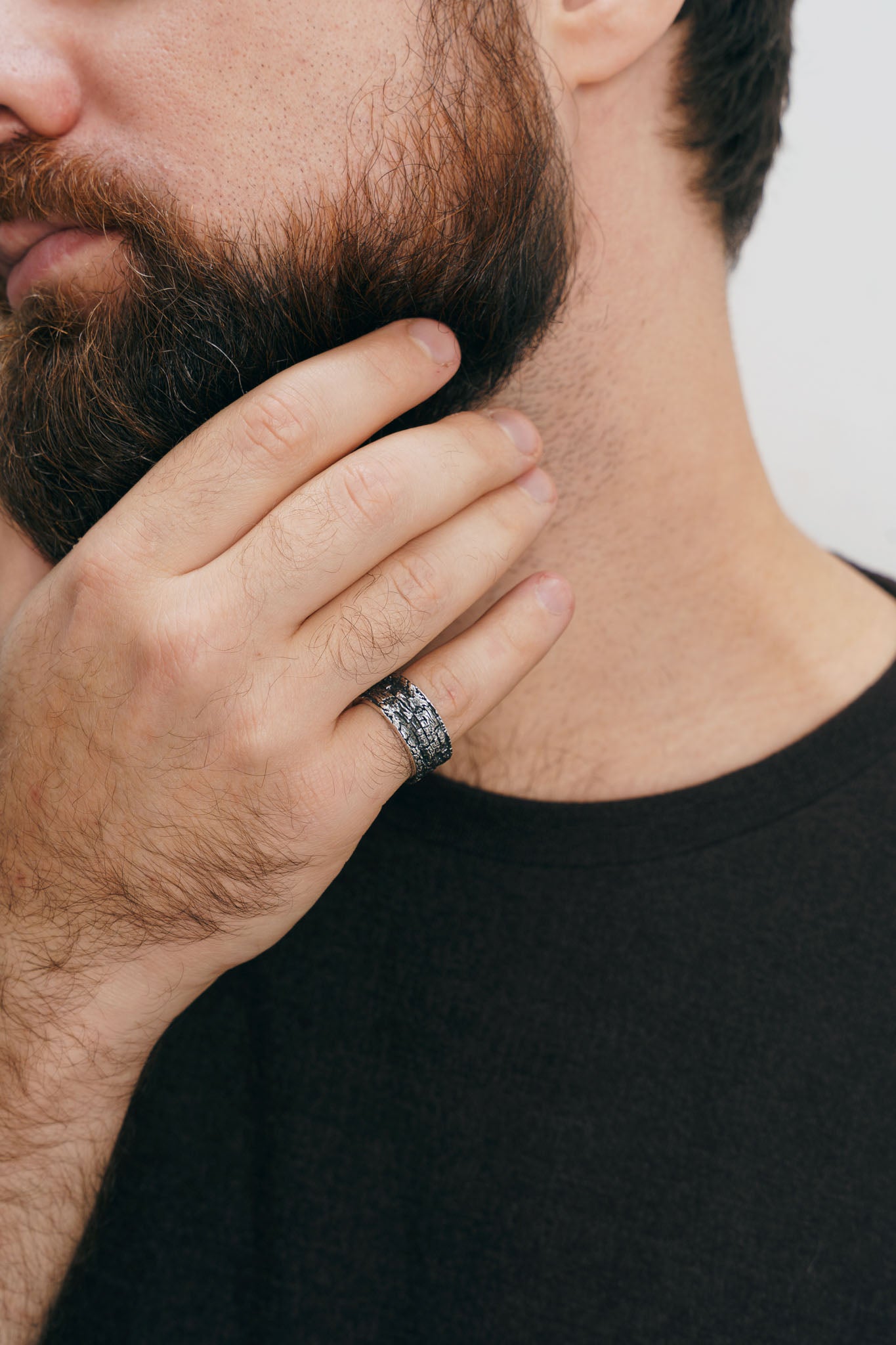 Кільце «Деревне вугілля» з чорнінням (10 мм) — це неймовірна прикраса ручної роботи, створена зі срібла або золота, яка поєднує природний рельєф і сучасну елегантність. Фактурна поверхня відтворює структуру обвугленої деревини, а чорніння додає глибини та контрасту, підкреслюючи кожен рельєфний штрих.