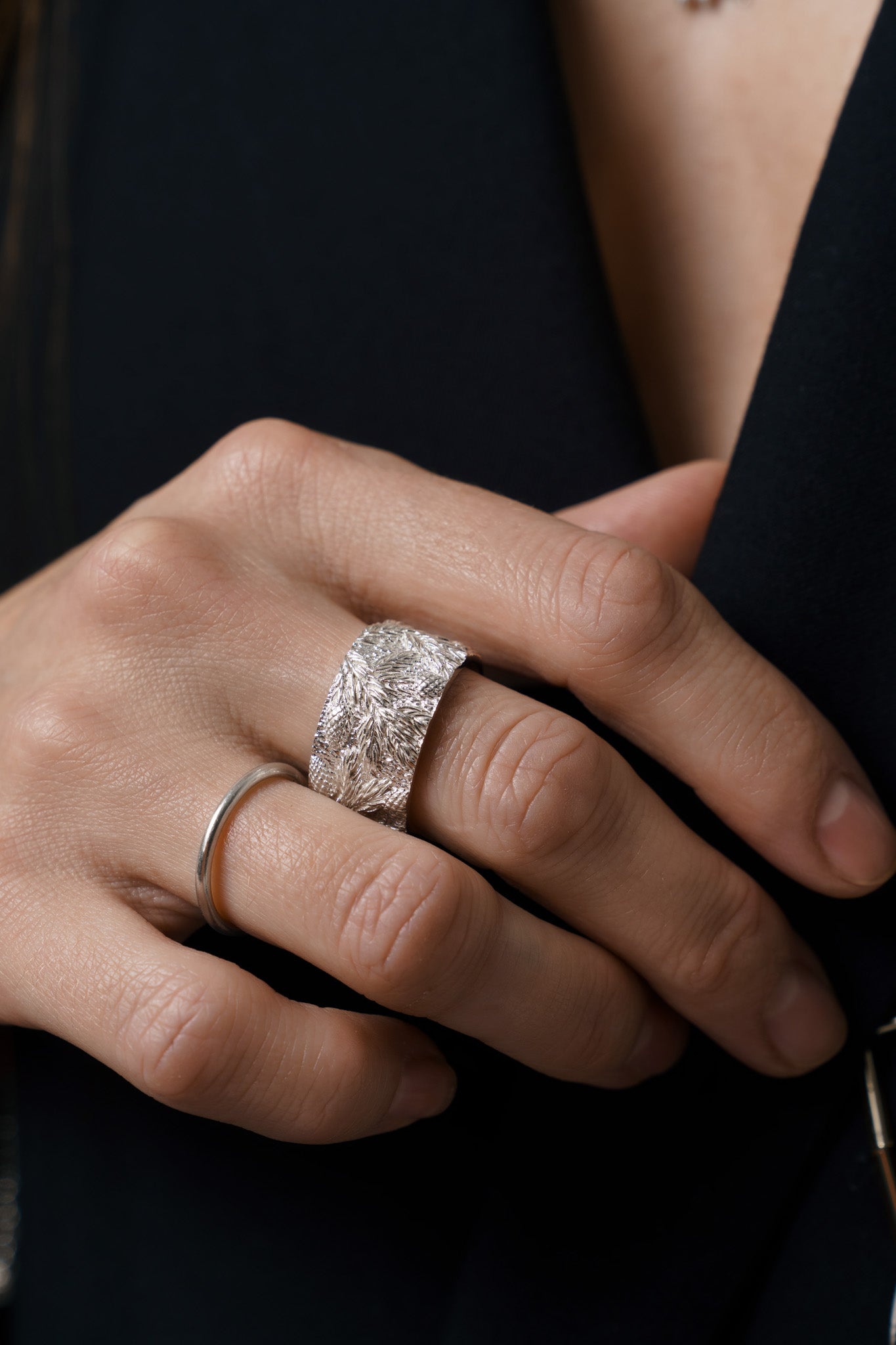 Каблучка «Карпатська смерека» — прикраса, у якій оживає дух гірського лісу. Її рельєфна поверхня відтворює текстуру смереки — дерева, що століттями стоїть на сторожі карпатських хребтів, зберігаючи силу природи й тишу гірських стежок. У сріблі чи золоті цей мотив звучить особливо виразно, поєднуючи природність і витонченість.