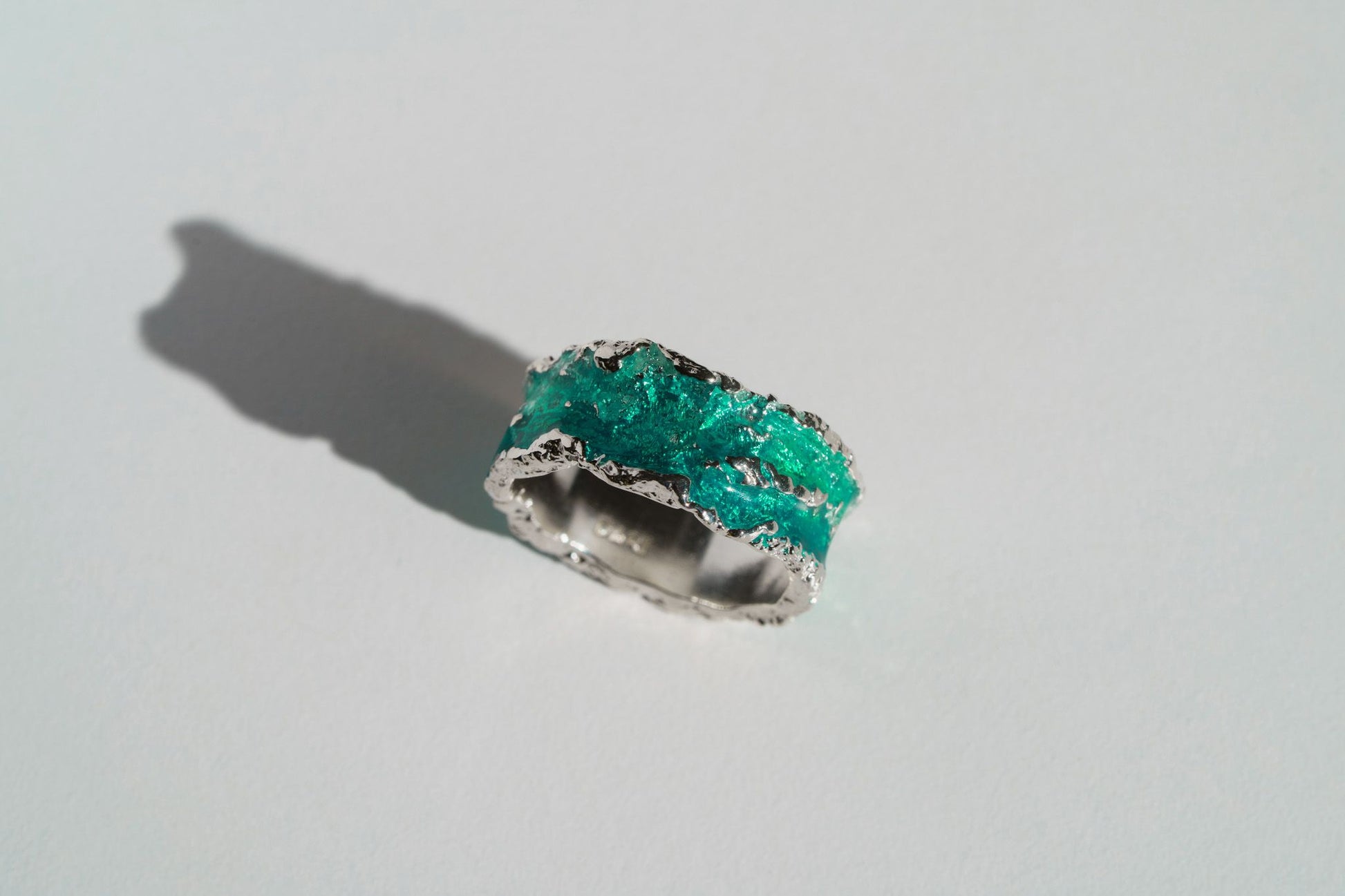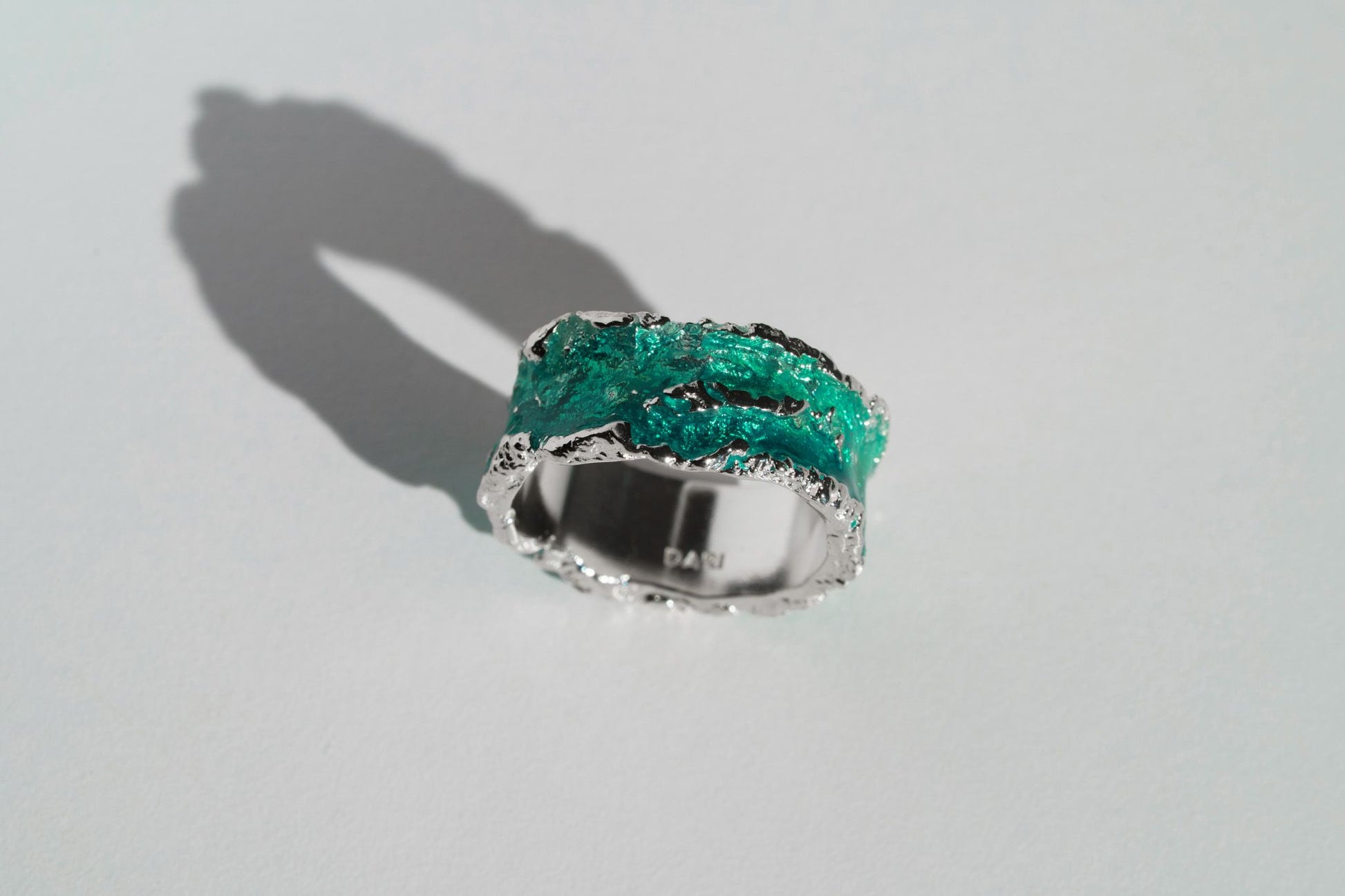 Кільце «Хвиля» — стильна та виразна ювелірна прикраса, що символізує силу та гармонію природи. Її ширина в 10 мм робить каблучку потужною деталлю образу, а смарагдовий відтінок нагадує про чистоту океану. Плавні лінії дизайну, натхненні хвилями, створюють відчуття руху та енергії. Ця каблучка стане яскравим акцентом у будь-якому стилі, ідеально підходячи для тих, хто прагне виразити свою індивідуальність і динамічний характер.