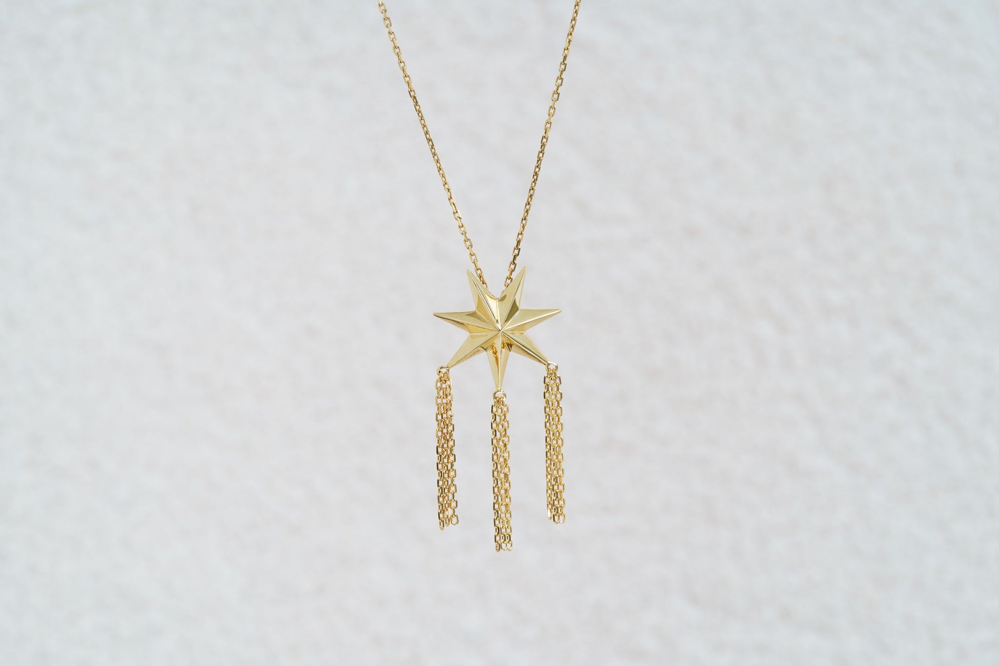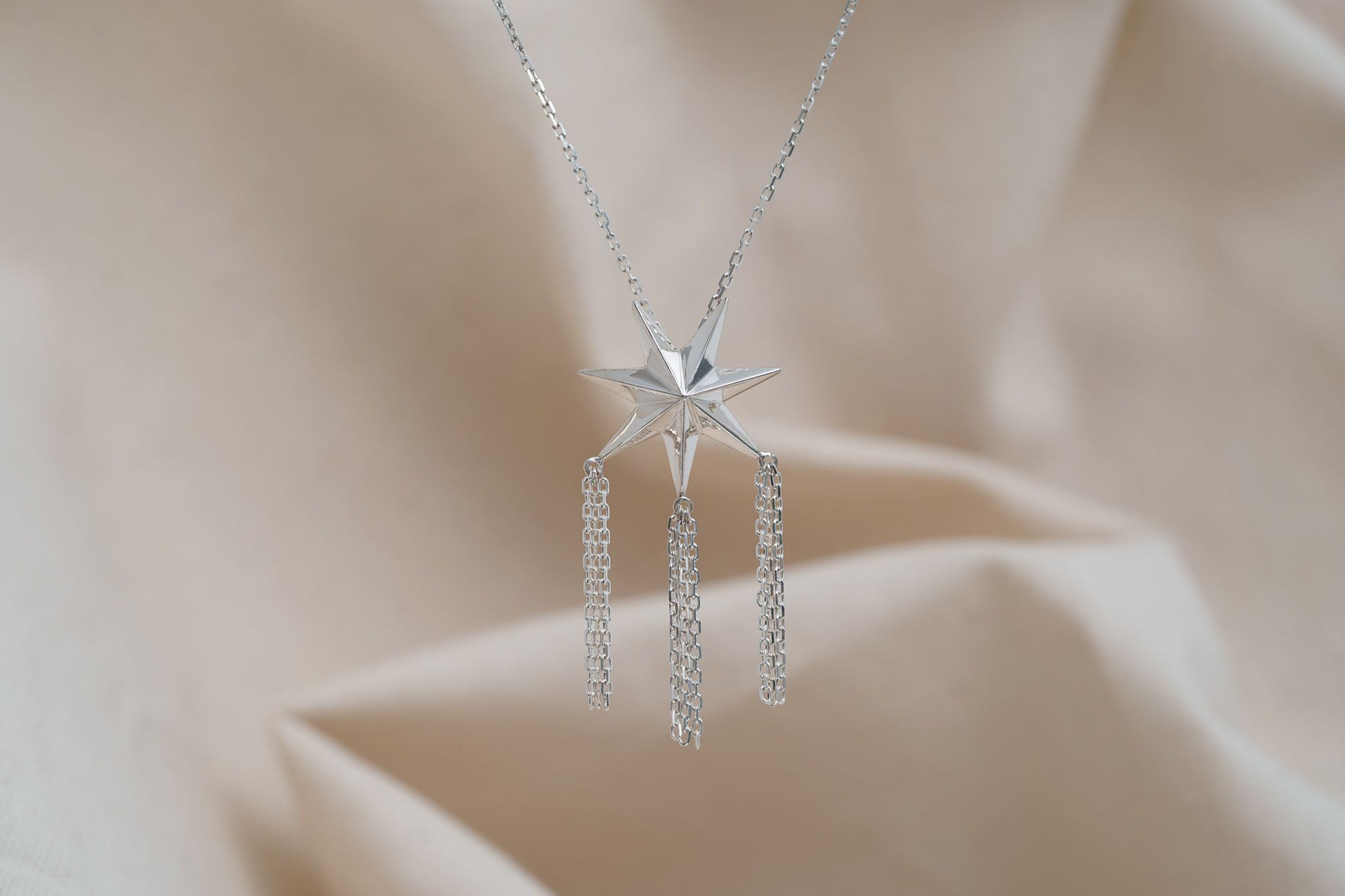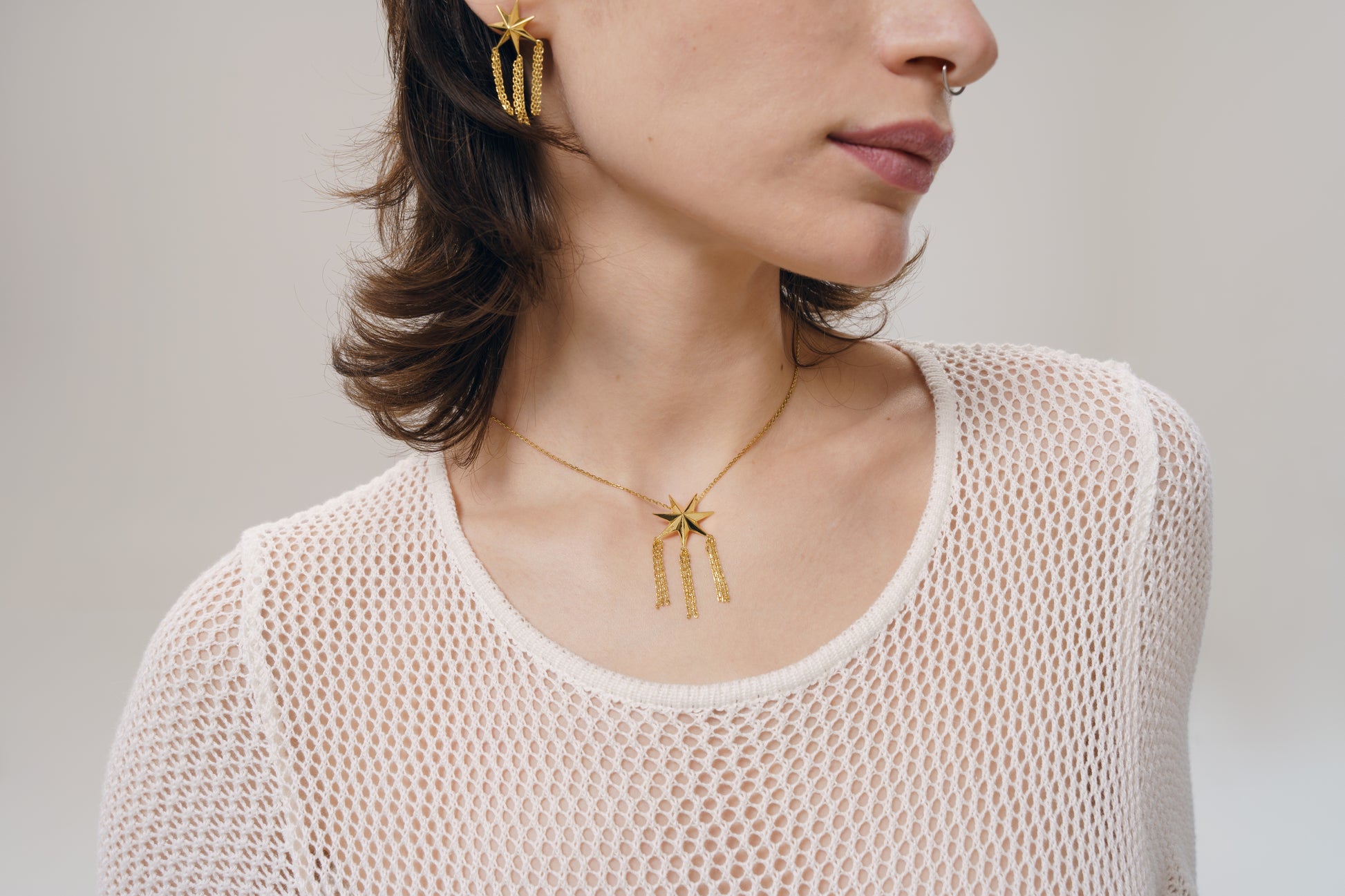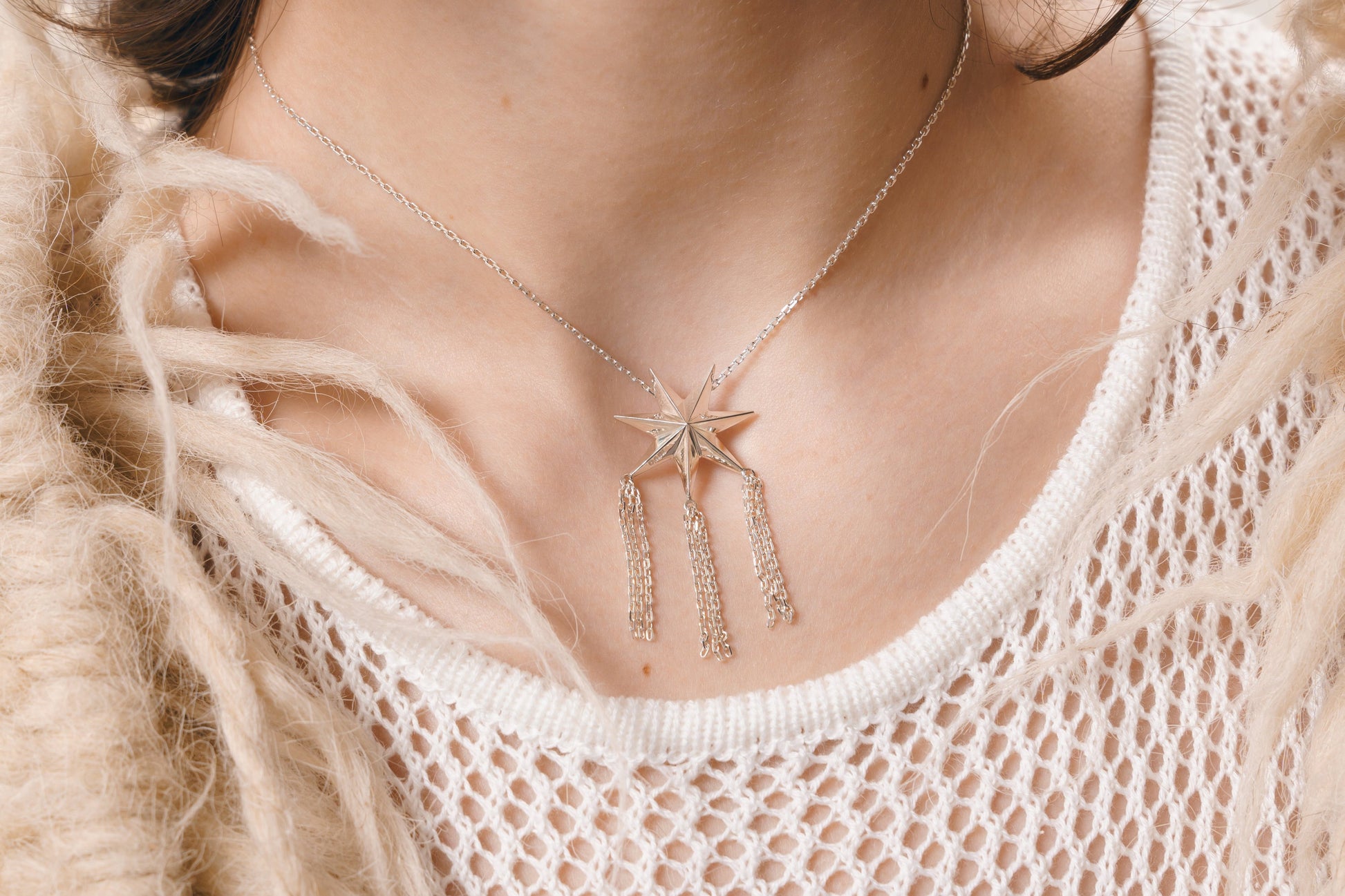 Кольє «Провідна зоря» з ланцюжками — це вишукане поєднання класики та сучасності. Ланцюжки додають динаміки та роблять образ більш цікавим.