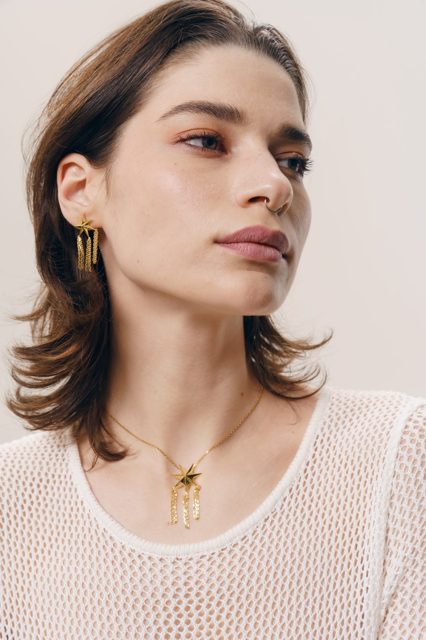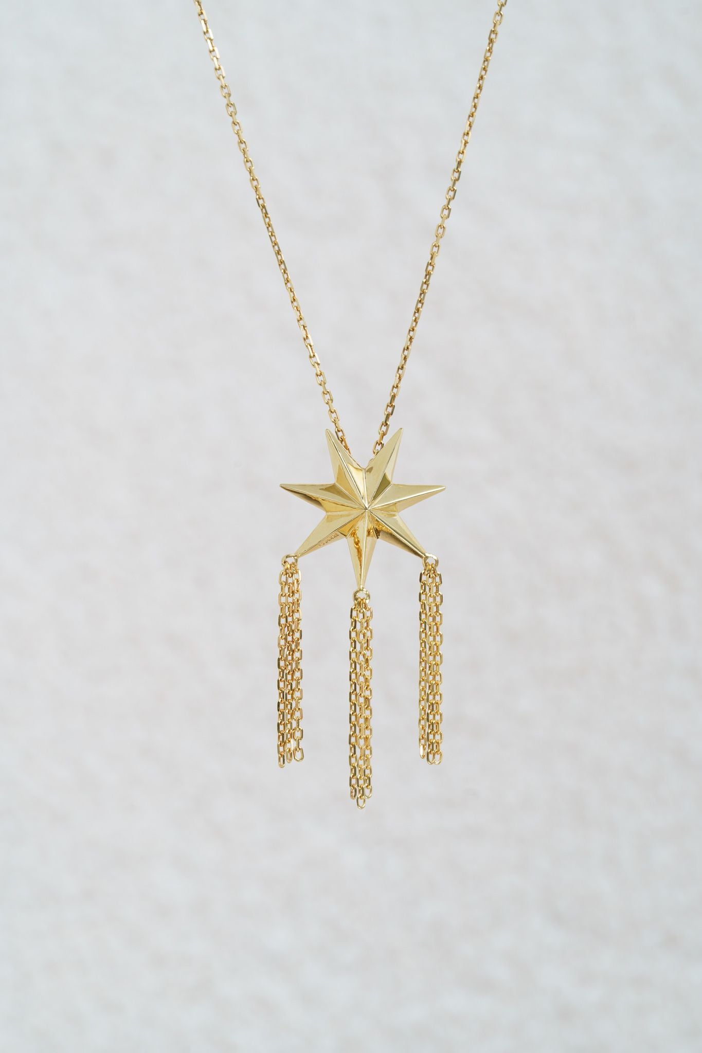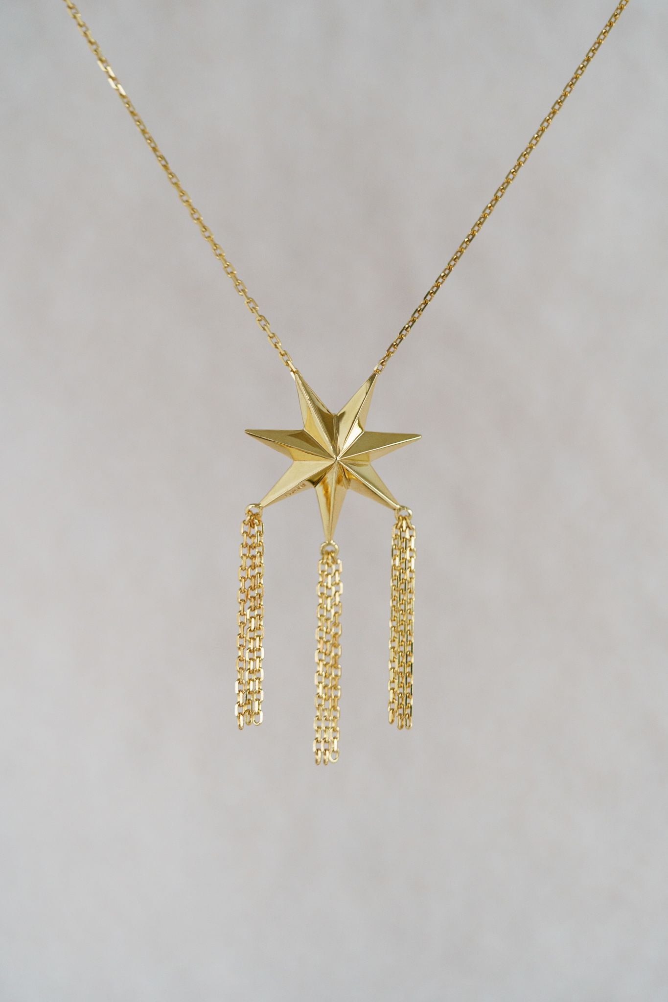 Кольє «Провідна зоря» з ланцюжками — це вишукане поєднання класики та сучасності. Ланцюжки додають динаміки та роблять образ більш цікавим.