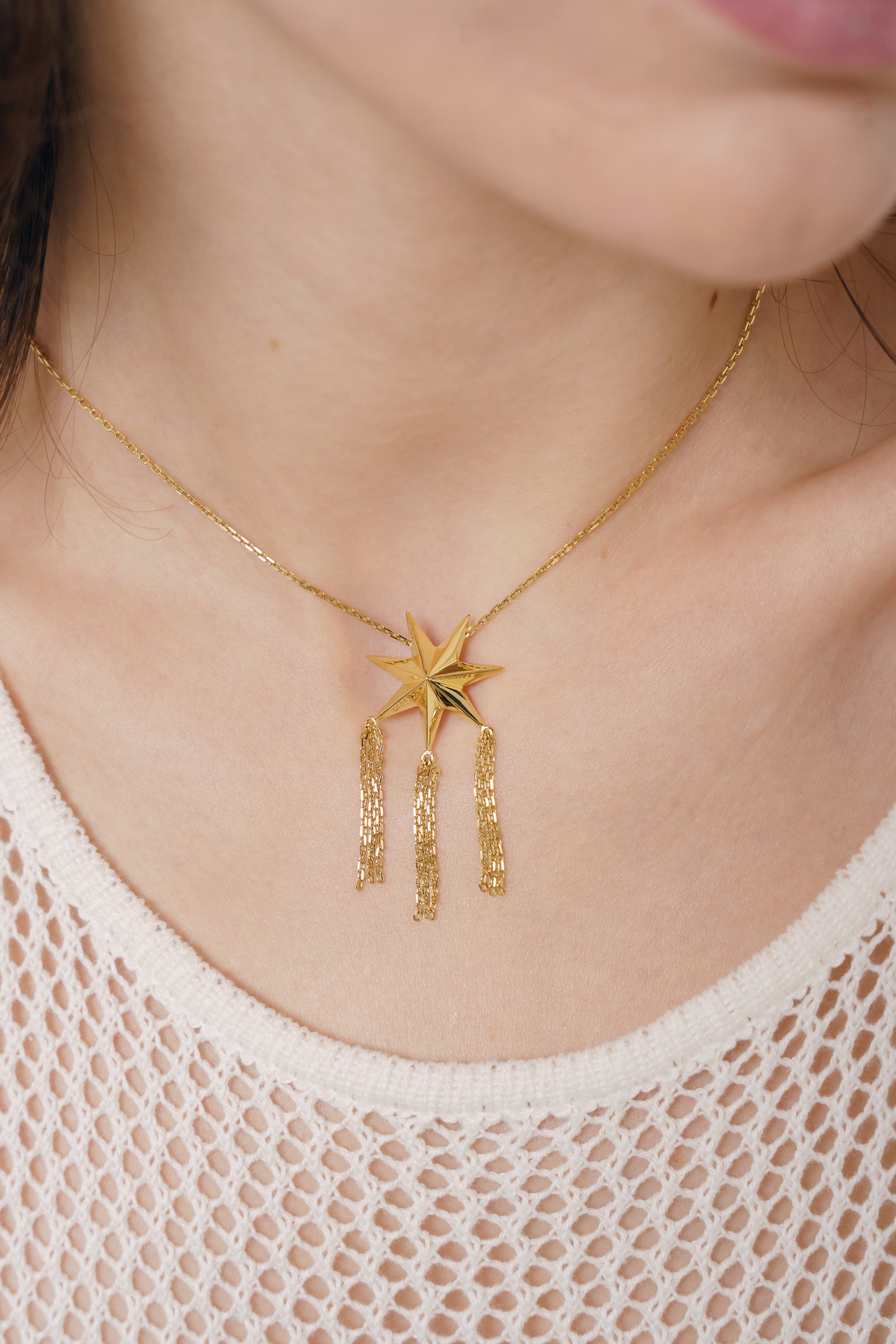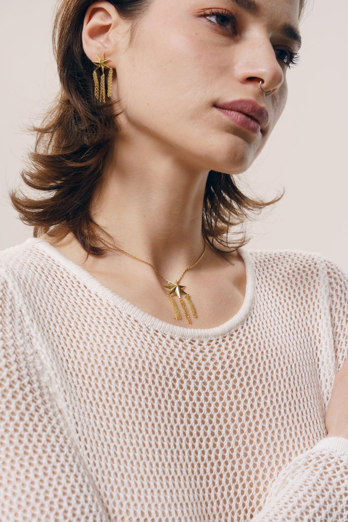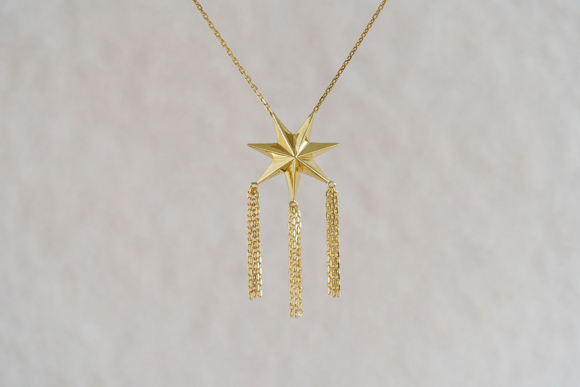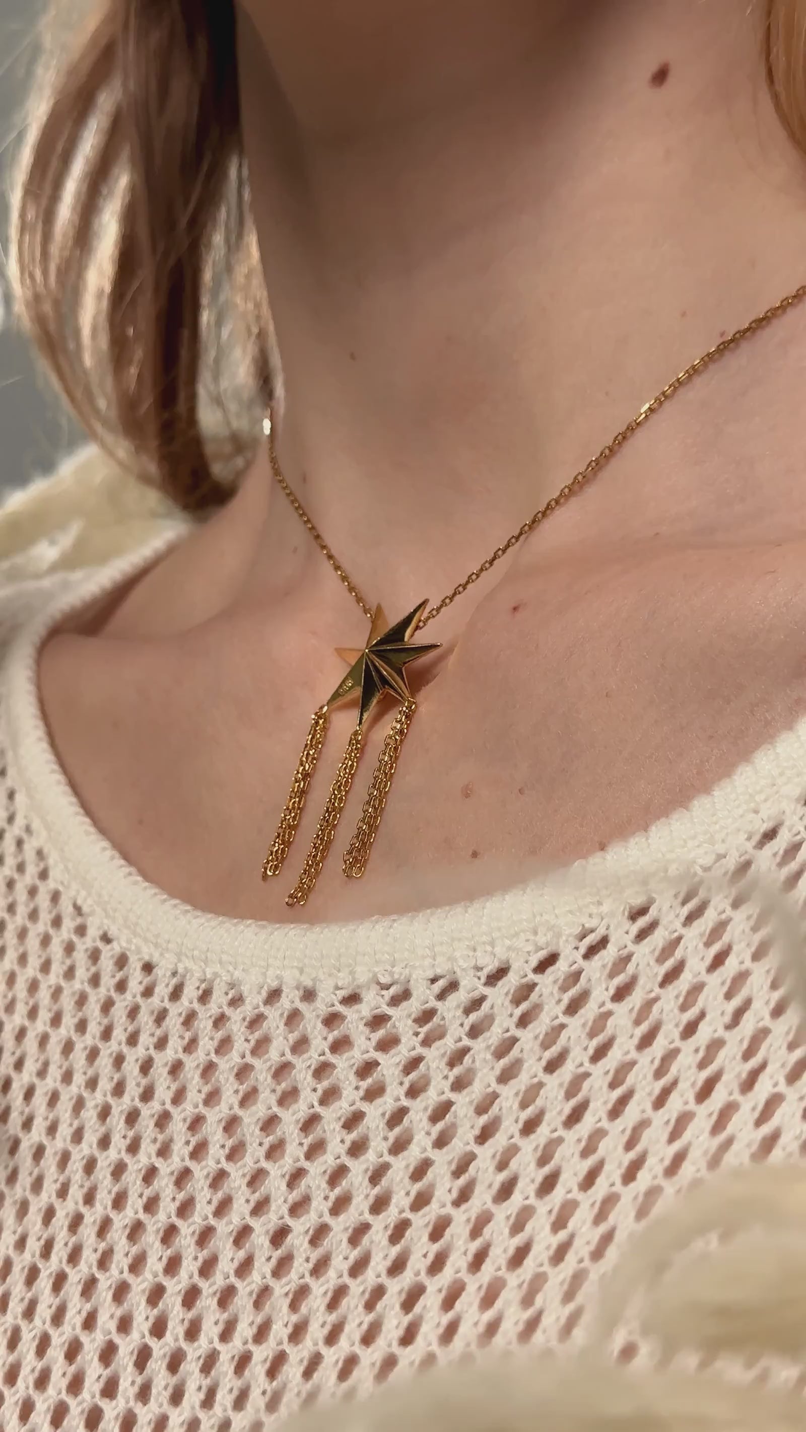 Кольє «Провідна зоря» з ланцюжками — це вишукане поєднання класики та сучасності. Ланцюжки додають динаміки та роблять образ більш цікавим.