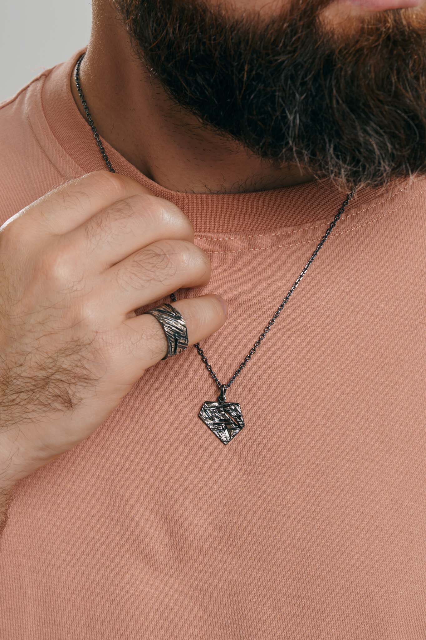 Кулон «Колотий лід» з чорнінням — це про крихку красу й внутрішню силу з характером. Фактура нагадує замерзлу поверхню води, ніби лід, розбитий на фрагменти: кожен відблиск унікальний і неповторний, а світло оживає в русі. Чорний фініш додає глибини та контрасту, підкреслює рельєф і робить текстуру ще більш виразною — стримано, сучасно й впевнено.