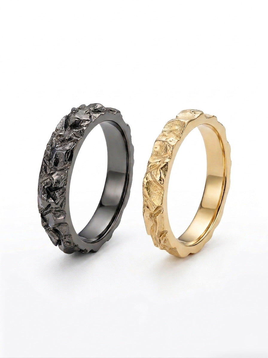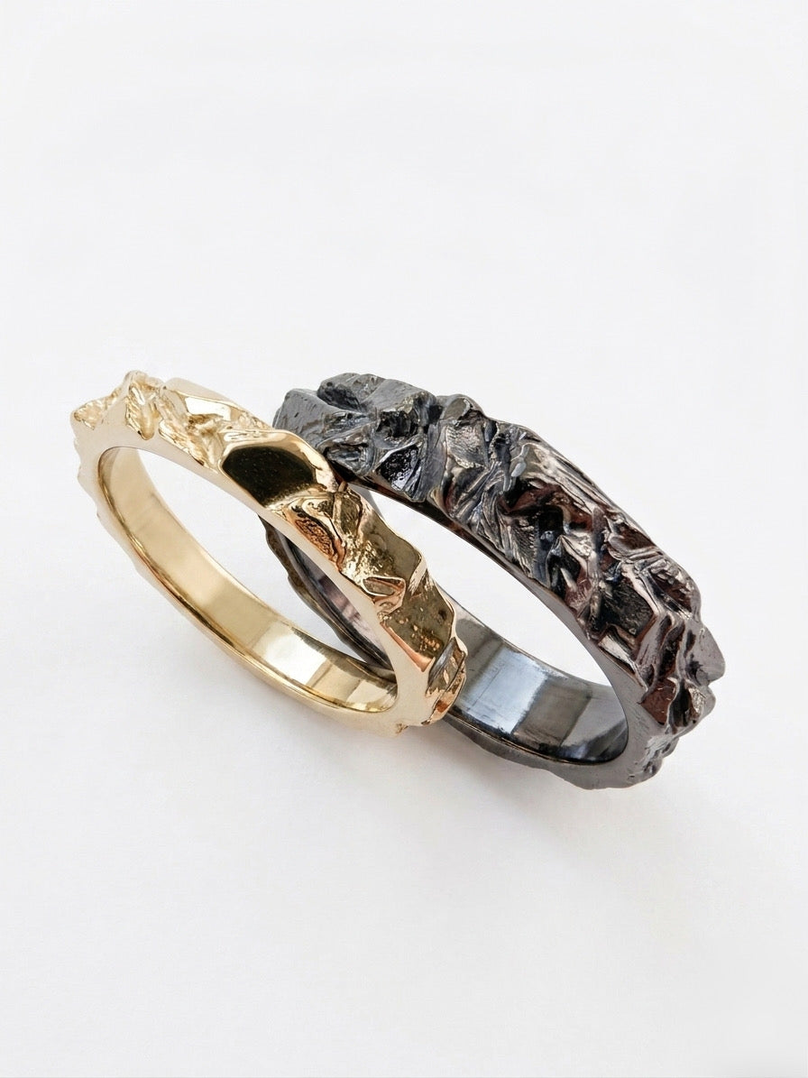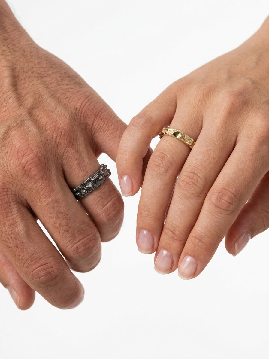 Пара обручок «Гранітна скеля Коростишівського каньйону» — це символічні прикраси, що відображають міцність і непохитність почуттів. Світла обручка (3 мм) та темна (5 мм) створені для того, щоб доповнювати одне одного, уособлюючи баланс та гармонію в стосунках. Їхня фактура, натхненна гранітними скелями, додає природної краси та унікальності, що підкреслює глибину і особливість зв’язку між закоханими.