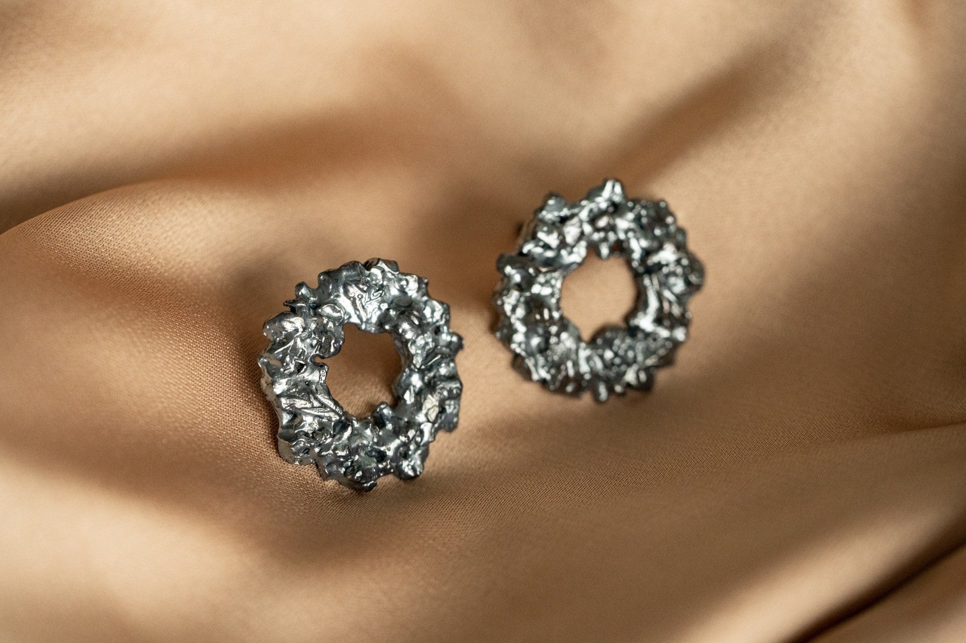 Сережки-пусети «Скупчення астероїдів» — оригінальна прикраса ручної роботи зі срібла або золота. Їхній унікальний дизайн натхненний космічною тематикою та відтворює фактурність астероїдів, надаючи образу сучасності й виразності. Легкі та зручні у носінні, ці сережки підходять як для щоденного стилю, так і для особливих подій, стаючи стильним акцентом у вашій колекції прикрас.